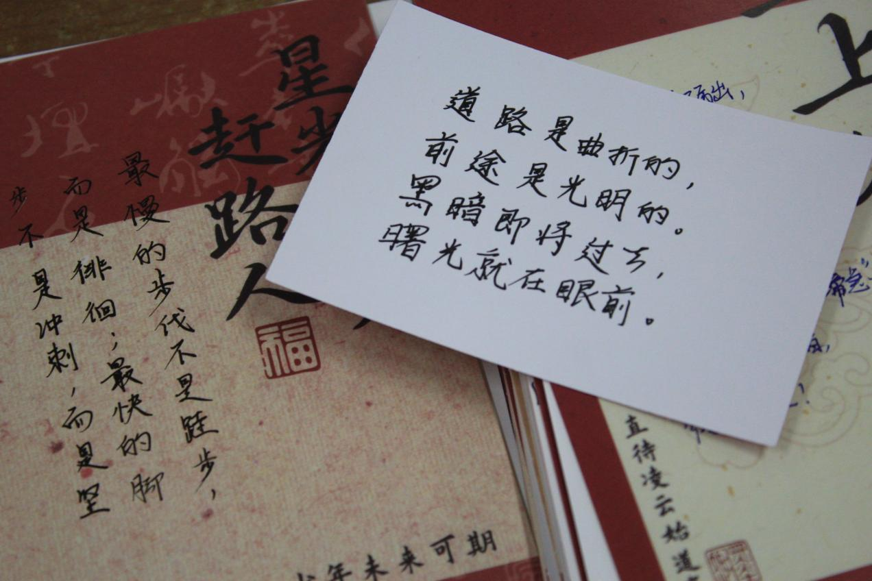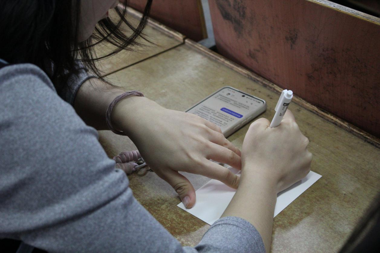 活动筹备阶段,学院广泛动员低同学参与祝福书写,同学们踊跃响应,纷纷拿起笔杆,在贺卡上写下对学长学姐的美好期许与真诚鼓励。“愿你披荆斩棘,终登理想殿堂”“笔锋所至皆坦途,一战成硕遂心愿”,一句句暖心话语、一张张精致贺卡,凝聚着学弟学妹们的祝福,成为冬日里最动人的温暖。参与同学在完成祝福书写后,有序进行现场签到,现场活动秩序井然。