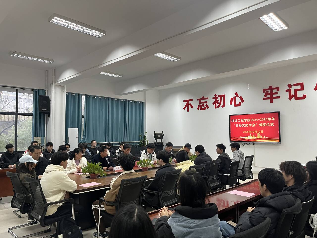 12月12日下午,南华大学机械工程学院2024-2025学年“邦裕奖助学金”颁奖典礼在雨母校区机械楼212会议室举行。校友代表李志杰、学院党委书记王湘江、党委副书记唐康伟、副院长唐德文、获奖学生及部分学生代表齐聚一堂,共同见证了这一荣誉时刻。典礼由唐康伟主持。