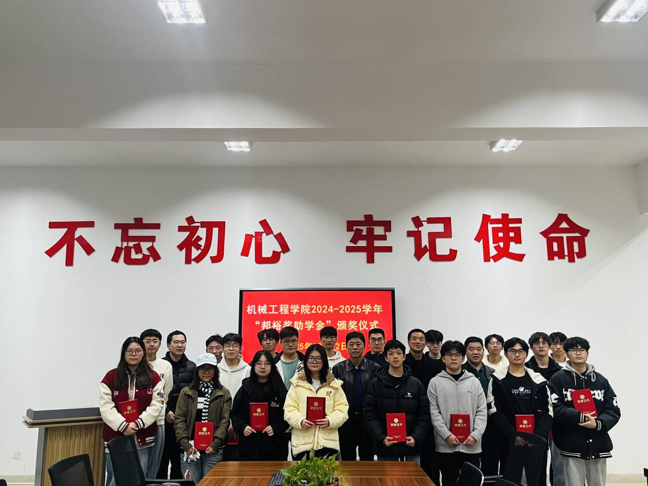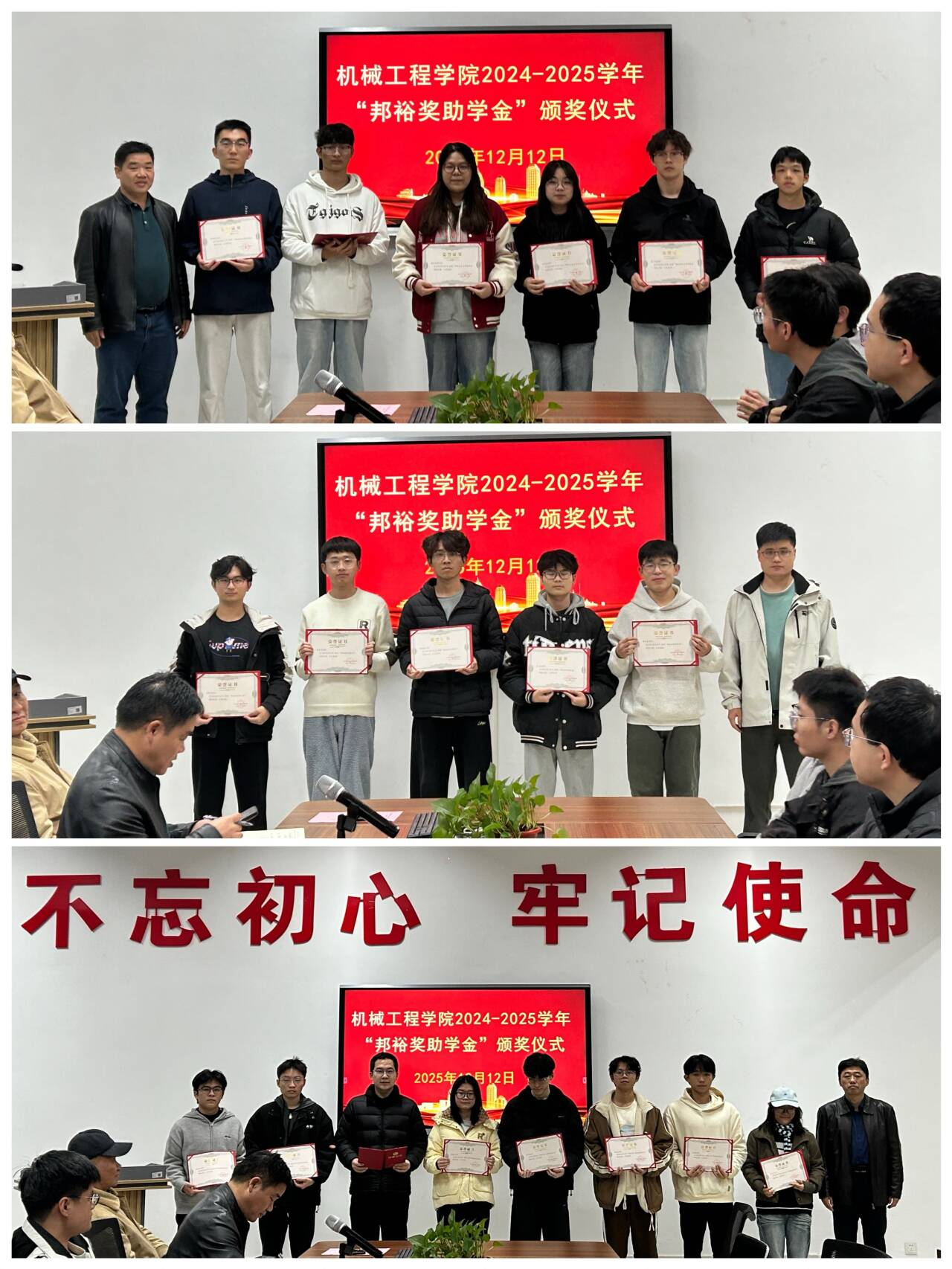 据悉,“邦裕奖助学金”是由机械工程学院机械专业95级校友思诺冶金设备(上海)有限公司董事长王邦裕于2024年开始设立,共设立五届,包含励志助学金、创新奖学金、至善至孝奖学金等三类,旨在激励品学兼优、自强不息的机械学子。未来,机械工程学院将继续激励全体学生勤奋学习、奋发有为,营造崇尚先进、追求卓越的良好学风,不辜负校友的期望与支持,为学校、国家培养栋梁之材!
