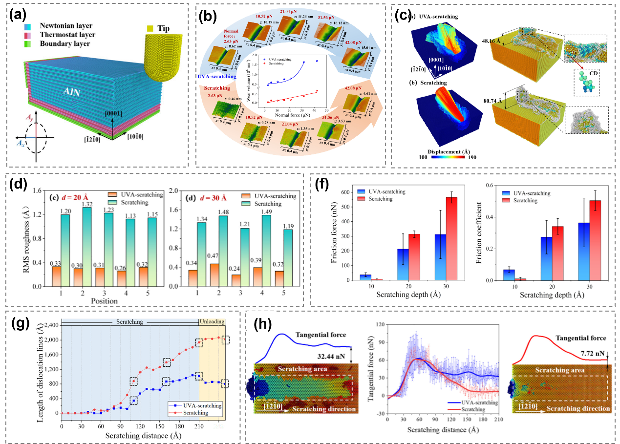 针对上述问题,研究团队首先采用分子动力学(MD)模拟构建了单晶AlN超声振动辅助纳米划擦模型,系统比较了不同划擦深度下的材料去除行为、摩擦学性能及亚表面损伤特征。结果表明,超声振动辅助划擦可显著降低切向力、法向力及摩擦系数,在相同划擦深度下材料去除率明显高于普通划擦,且更易实现均匀单层原子去除;划痕表面的均方根粗糙度仅为普通划擦的三分之一。进一步分析表明,超声振动能有效抑制划擦诱导的材料堆积和亚表面损伤(位错与堆垛层错),其机制在于高频振动作用降低了应力分布范围,缓解了局部应力集中。为验证模拟结果的可靠性,团队基于原子力显微镜(AFM)开展了相关实验。发现实验与模拟结果相近——当法向载荷一定时,超声振动辅助划擦去除体积显著高于普通划擦,且随法向力呈指数增长;普通划擦行为则符合经典的Archard定律。模拟和实验结果共同证明引入超声振动能够提升去除效率、改善表面质量。